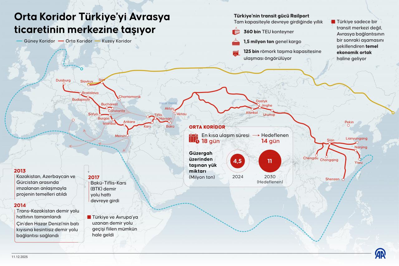 Türkiye’nin koridordaki stratejik rolü ise Kocaeli’de geliştirilen Railport intermodal terminalinden ilk tren çıkışının 21 Kasım’da gerçekleştirilmesiyle daha da görünür hale geldi.